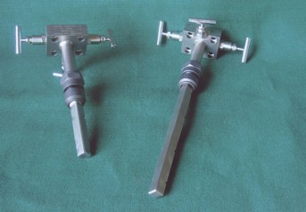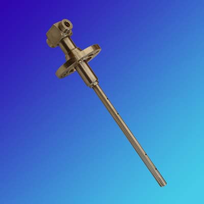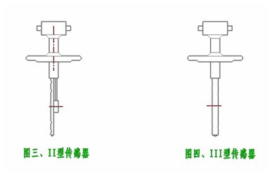 3.2.1、Ⅰ型,适用于(20~50)㎜的管道,外形如图2所示。其检测杆直径一般为4.5~6.5㎜,传感器与管道的连接方式有两种:一种是螺纹连接,另一种是法兰连接。用于高压测量时都采用法兰连接,如下图所示 ![]() 3.2.2、Ⅱ型,适用于40~100㎜的管道,外形如图3所示。