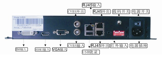 DVI接口,HDMI接口,VGA接口,CVBS接口,CVBS环出接口,RJ45控制输入接口,USB接口升级,RJ45控制环出接口,红外接口。