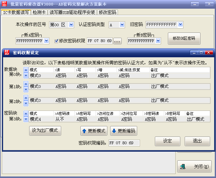 支持客户AB密码方案,如有些客户需要“用B密码来改A密码,而A密码不能自己A密码,A密码只有用来读、写、增、减数据块第0、1、2块”的功能,这时就需要下载以下开发包,仔细研读说明文档关于piccchangesinglekeyex函数的操作,并用我们的测试程序取出适当的AB密码权限访问字编码,测试程序图片请看下图