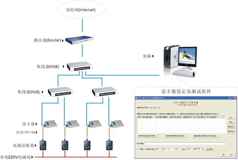 IC-11型 TCP/IP接口读卡器是一款能利用现有的计算机网络,不需要独立布线就可以组成一个高性能低成本实时联网IC卡管理系统的端终设备,刷卡后即时向远程计算机传送卡号信息,电脑对刷卡信息运作处理后,可即时向读卡器发送相应的响应提示用户或进行其他操作。TCP/IP接口读卡器已广泛用于计费,计件薪酬管理、人事考勤,身份识别等场合。