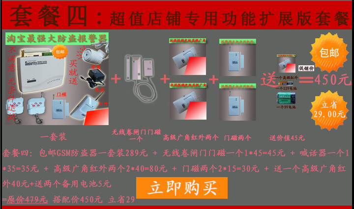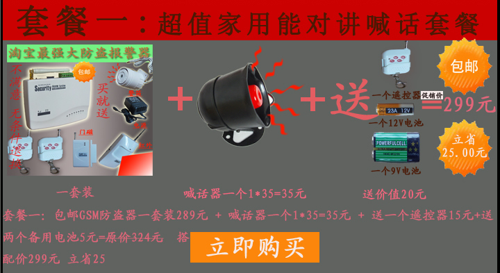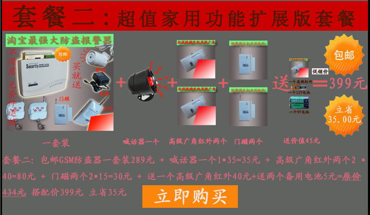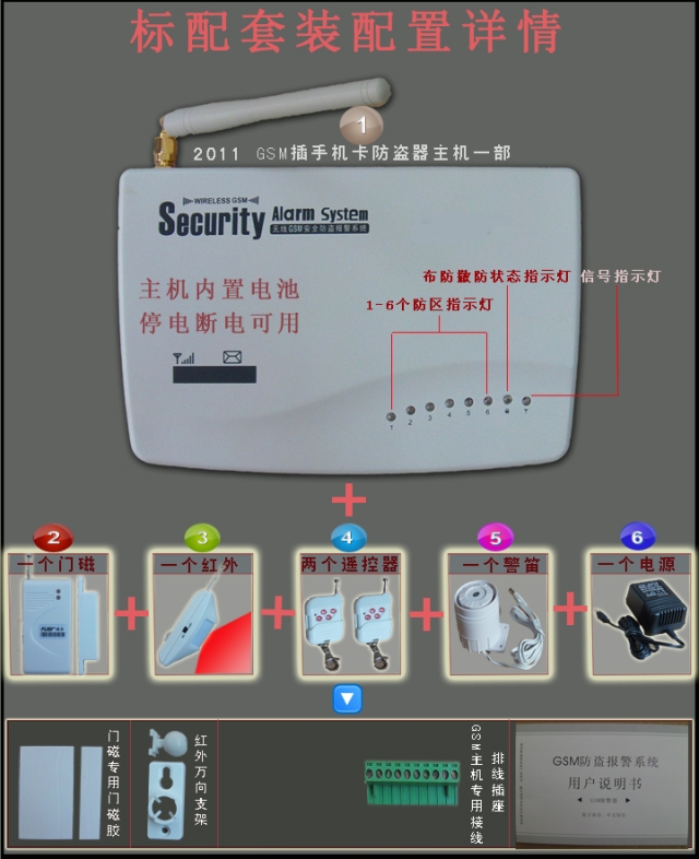 标准配置:主机1部 + 高级广角红外1个(自带9V电池)+ 门磁1个(自带12V电池)+ 遥控器2个(自带12V电池)+ 电源1个+警号一个.