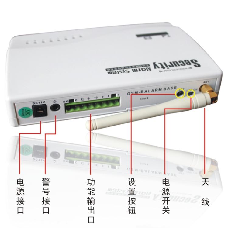 特色功能:可通过短信远程控制报警器,布防撤防,可以再外接喊话喇叭,主人通过手机对现场进行语音喊话(需外接有源喇叭在speak接口),报警时首先短信告知主人报警防区,然后马上电话拨号报警。接通后您可以通过电话进行远程通知。