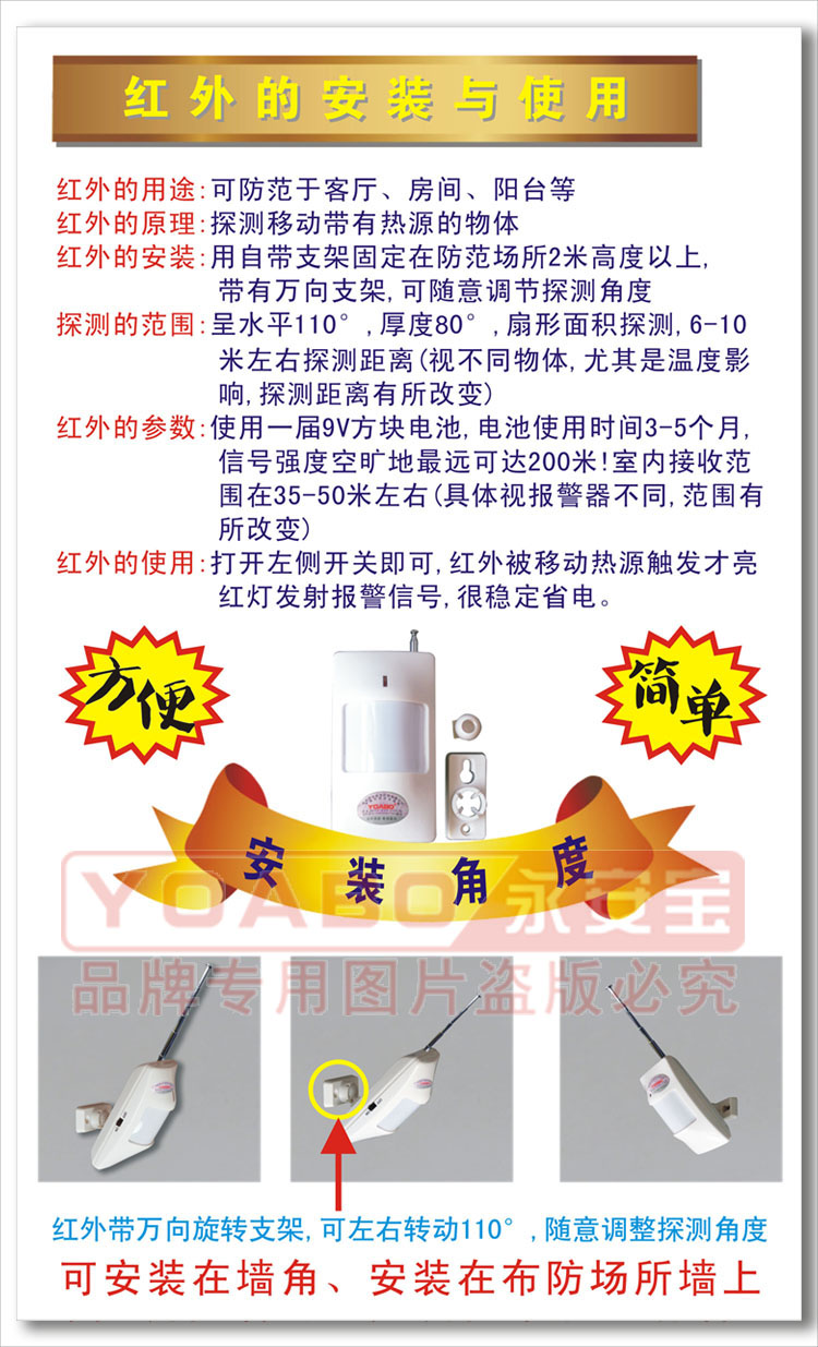 红外探测器(分广角红外和幕帘红外)用万象座固定在客厅墙角,当有盗贼入侵进入到探测器的探测区域时,红外探测器就会发射报警信号给主机;
