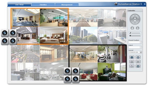 不仅本机摄影机可以加到实时影像版面,其他 DiskStation 的摄影机也可以整合加入实时影像画面上。集中化管理系统可串连多部 DiskStation 成为大型的布署系统,也可以将一台 DiskStation 作为整个系统的单一管理窗口。