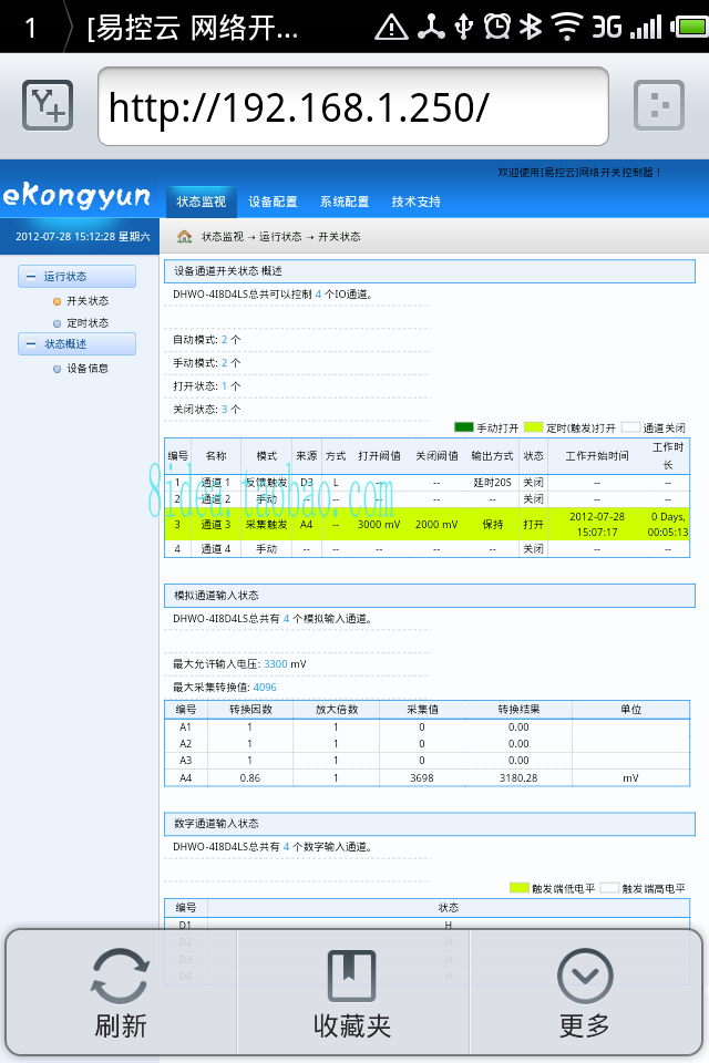 DHWO-4I8D4是由晶通物控推出的‘易控云’系列产品中一款集成WEB网页服务器的网络控制开关。设备包含4个模拟量输入通道,4个数字量输入通道以及4个10A250V的Z型继电器用于电器控制。通过设备内置的WEB开关控制程序可以实现模拟/数字量的反馈控制。比如某工业控制现场使用温度采集器采集温度信息,在温度上长升时32℃时需要打开一路风机,35℃时再打开一路,40℃时打开第三路,43℃时打开第四路。温度下降时40℃关闭第四路,35℃关闭第三路,32℃时关闭第二路,30℃时关闭第一路。这一过程可以通过易控云DHWO-4I8D4LS采集触发模式智能实现,并且这一过程可以通过浏览器实时查看。还可以使用数字量信号控制输出端,如将人体热释电红外信号接入到数字量输入端。当有人经过时将自动门打开,电灯打开,延时指定的时间将其自动关闭。传统的手动控制与定时控制本设备仍然支持。由于设备内置了网络服务器,因此无需使用上位机软件。并且具备了很好的跨平台特性,安卓,苹果,WINDOWS,UNIX等系统都可以正常控制与访问。
