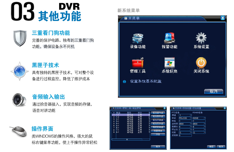 系统资源:同时多路录像,多路辅码流,多路回放,多路网络操作,USB备份,刻录