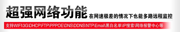 网络功能: 内置WEB SERVER,拥有Email报警邮件,FTP,DDNS动态域名,PPPOE拨号,DHCP自动获取IP地址,NTP自动校时,UPNP端口自动映射,IP黑白名单等功能
