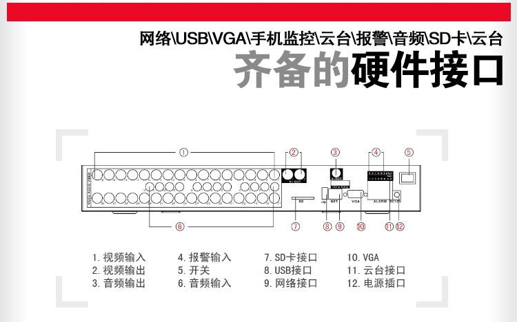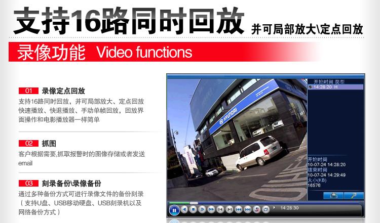 系统资源:同时多路录像,多路辅码流,多路回放,多路网络操作,USB备份,刻录