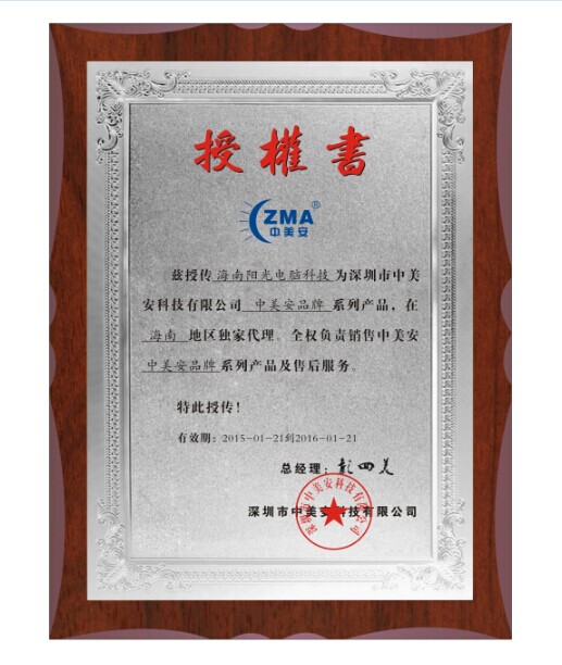 经深圳中美安科技授权,海南阳光电脑科技为海南白马井地区的中美安产品唯一核心代理商,代表中美安公司全方面负责白马井地区中美安系列产品售前、售后工作。同时,享有深圳中美安公司给予的市场政策,在深圳中美安科技的支持下全面拓展整个白马井安防市场。