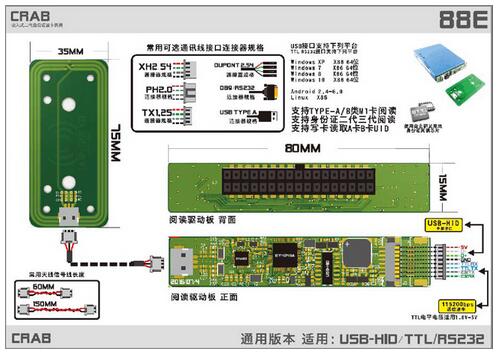 产品内含公安部授权的专用身份证安全控制模块(SAM),采用国际上先进的Type B非接触IC卡阅读技术,完成对身份证有效性验证和信息的实时读取。产品有USB接口,也可以根据需要定制使用RS232或TTL接口