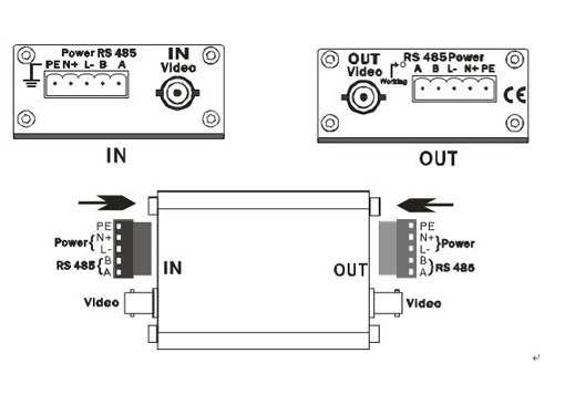 2、 防雷器的输入端(IN/雷电端)与输入线相连包括视频、控制485、电源,输出端(OUT/设备端)与被保护设备相连;不可以接反,带有PE标示的线接地。