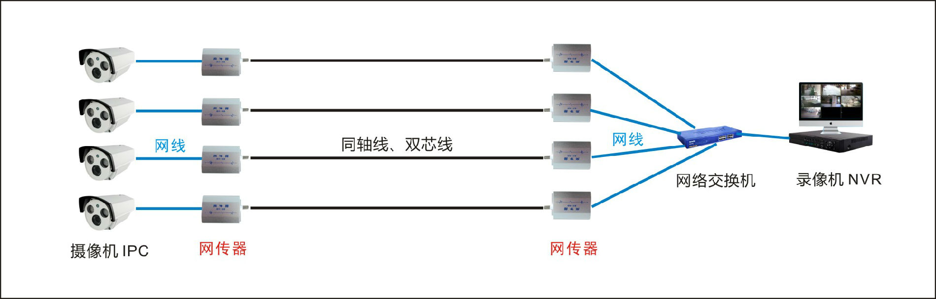 正好应用在原有老系统中,原有视频线或是双绞线可以保留使用,省去重新布线、挖沟的工作,省时省人力,直接在视频线的头尾各安装一个网传器,然后把之前的模拟摄像机换成新的IPC网络摄像机,把后端的DVR换成新的NVR录像机,多加一台网络交换机,就完成了系统改造升级的工作了。