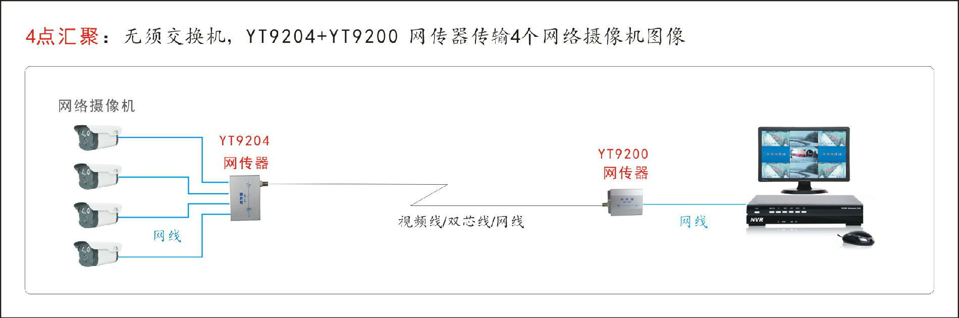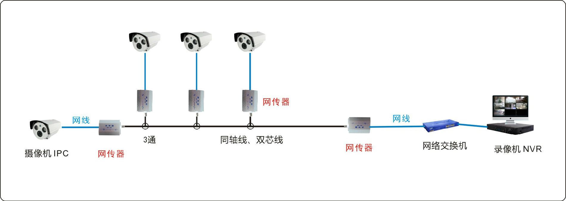 通过上述的布线示意,不难看出,采用网传器这种新型的设备,可以解决了IPC网络摄像机的传输限制,大大有利于网络摄像机在旧改方案中的应用,提升了旧改方案的工程进度,省时,省钱,省事,何不试试?
