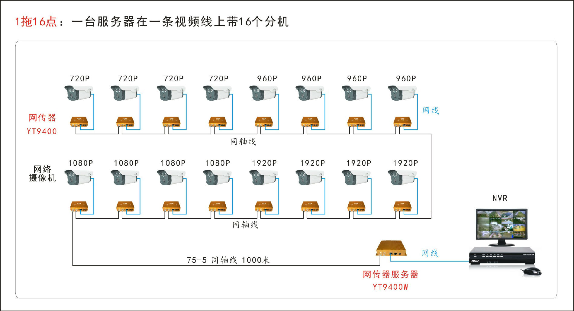 模拟监控中还有一种方案,采用共缆一线通方式做的,一条视频线传16个摄像头的,也可以通过这种设备来完成系统升级: