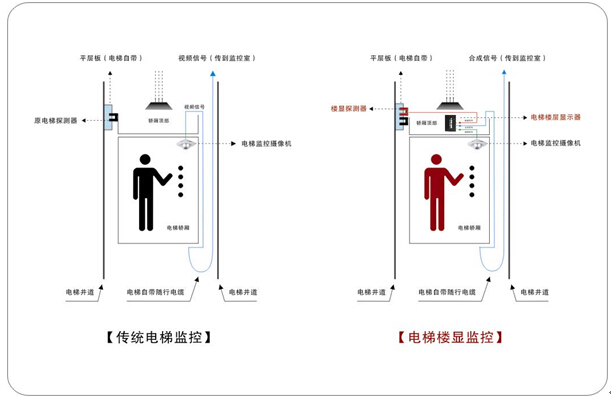 电梯楼层信号是通过探测器的两组信号收集器传送到楼显主机中,将其和摄像机输出的视频信号叠加为新的图文视频信号,送入监视器中。