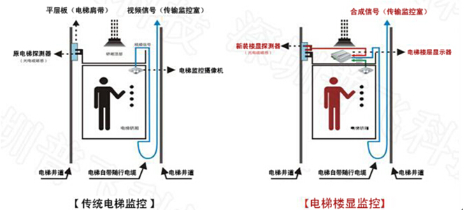 电梯楼层信号是通过探测器的两组信号收集器传送到楼显主机中,将其和摄像机输出的视频信号叠加为新的图文视频信号,送入监视器中。