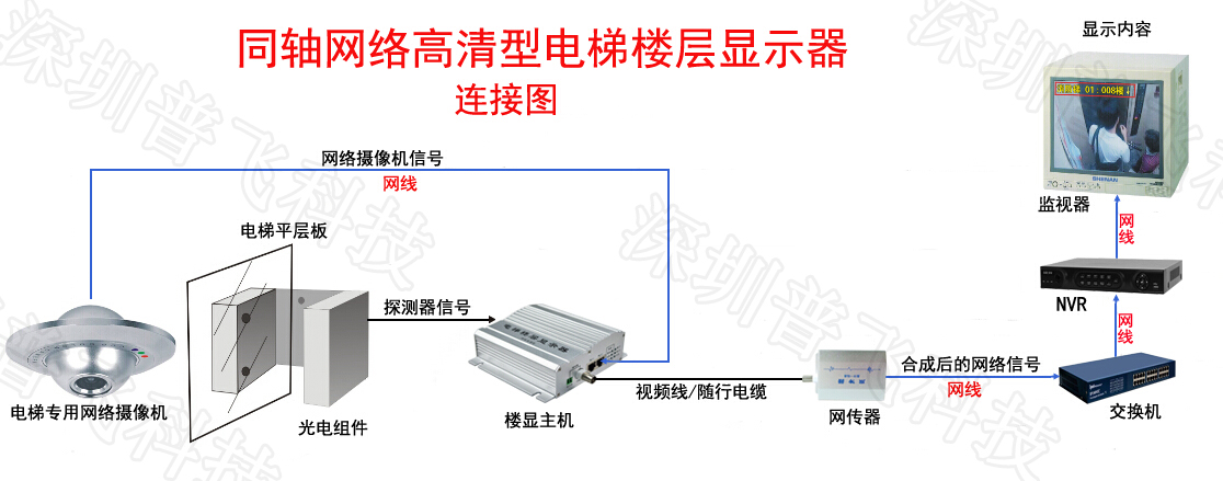 同轴网络型电梯楼层显示器将电梯上,下,停层等电梯运行状态字符叠加到监控视频画面上,内置兼容海康,大华,三星,天地伟业,宇视等20多种网络摄像机品牌协议,用户可自行选择。