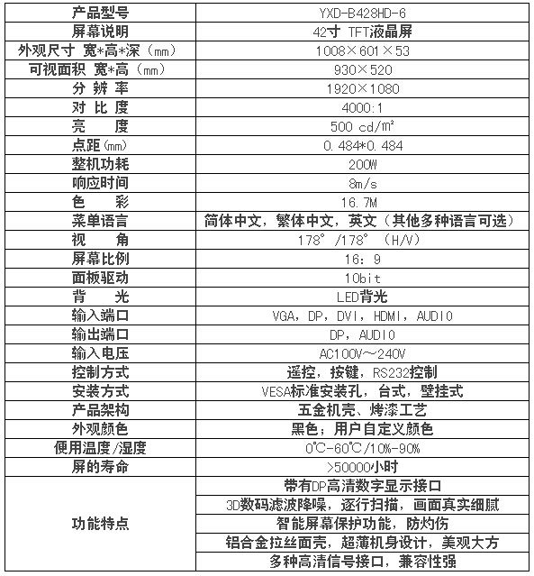 42寸高清监视器YXD-B428HD-6是雅迅达最新研发的监视器,该款监视器采用国际知名品牌(如:LG、三星、夏普等)液晶面板,以高分辨率、超高亮度/对比度,超宽视角范围将监视画面显示的更加真实、高清,且新品机身超薄,采用高铝合金拉丝做面壳,使机器更加美观大方。