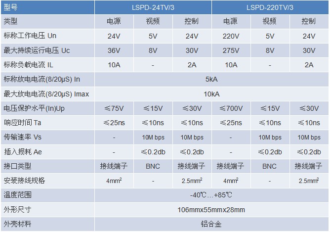 LSPD-220TV/3,LSPD-24TV/3,LSPD-12TV/3视频监控系统摄像机三合一防雷器(别称:三合一避雷器、三合一电涌保护器、三合一浪涌保护器、监控摄像机防雷器)主要用于监控球机电源和信号系统的全方位保护,是一体化多功能电涌保护器。适用于对监控摄像机的电源、视频/音频、云台控制线路实施浪涌保护,它具有通流容量大、限制电压低、响应速度快,安装方便等特点,可充分保护最新技术的监控设备。