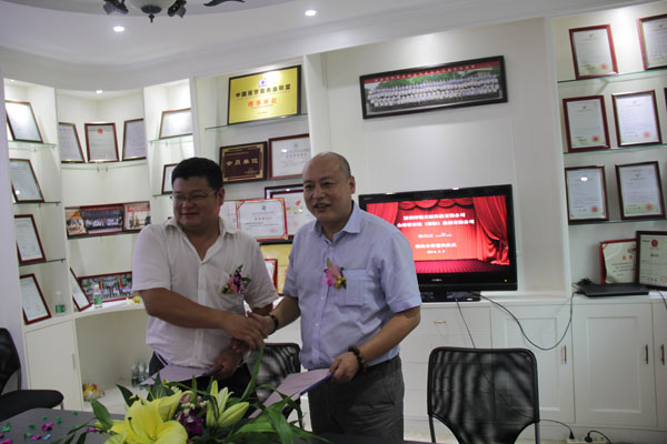 辉锐天眼总经理阮锐与全球锁董事长李谟湘在签约仪式上互换文本