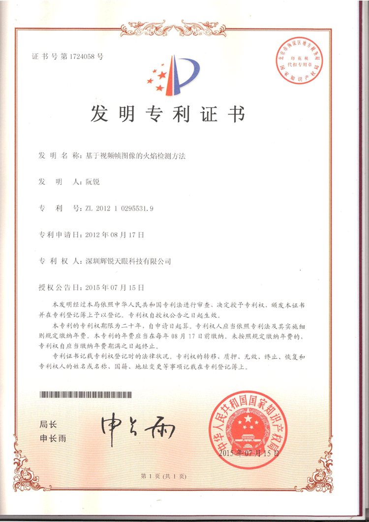 辉锐天眼获得“基于视频帧图像的火焰检测方法”发明专利,专利号ZL201210295531.9。该发明首次通过视频来检测及识别火焰,这对于预防火灾具有十分重要的意义。它不仅实现了对火焰的精确检测,使得火焰的误报率大大降低,而且有利于减轻工作人员的压力,提高其工作效率。
