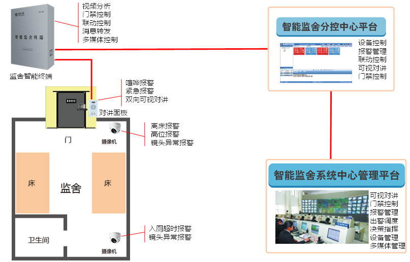 实现“可见、可听、可控、可管”的监舍管理控制水平。并且,通过监舍智能化自动报警与远程指挥中心接处警和报警转发到基层的处警机制,可以减轻基层值班人员的工作强度实现真正的“睡觉值班”、达到节约警力、优化警力部署的效果。