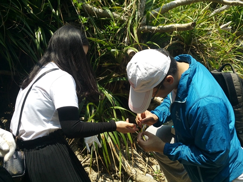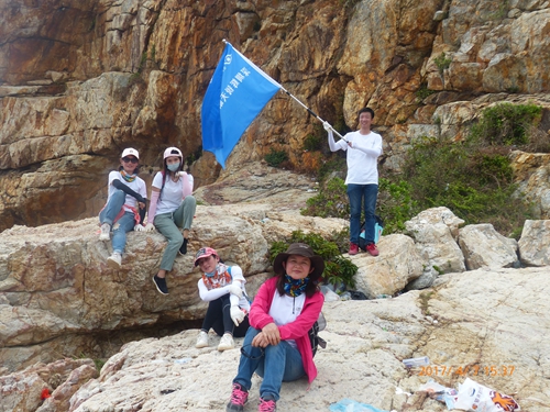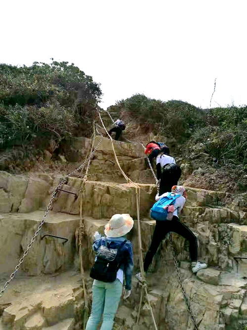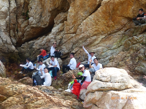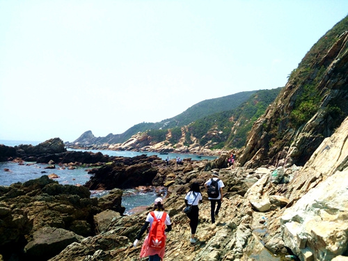 山海之间只有礁石铺路,大家只好蹦蹦跳跳的走着,从这块石头上轻轻一跃,跳到另一块石头上,一开始觉得十分有趣,可时间一长,腿脚就开始发酸了,部分同事由于体力不支速度渐渐慢了下来。