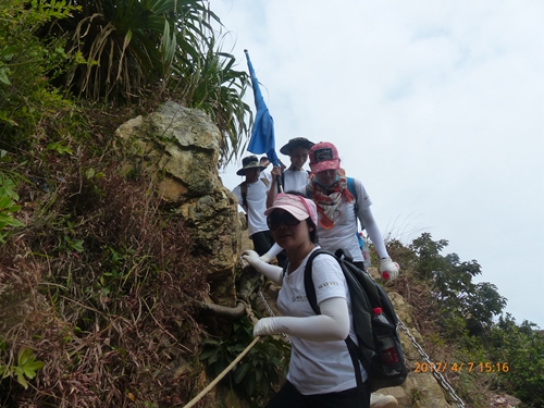 一个团结友爱的集体不会看着队友掉队,体力较好的同事都会主动充当“护航者”,帮扶鼓励其他同事继续前进。在攀爬中大家都互相提醒小心脚滑,注意绳索,一位女同事不小心在攀爬的过程中划伤了手,其他同事赶紧找来创口贴,细心的帮她包扎好伤口。