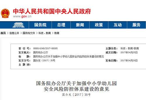 2017年4月,国务院发文《关于加强中小学幼儿园安全风险防控体系建设的意见》(以下简称《意见》)。