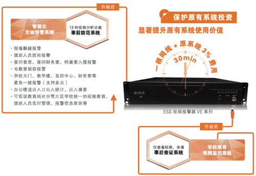 该方案是在学校原有视频监控系统的基础上接入辉锐天眼ESS视频报警器VE系列,即可对其进行智能化升级。升级后系统增加了围墙翻越报警、入侵报警、偷窃报警、值班脱岗报警、镜头异常报警、多点一键紧急报警等10多种智能视频分析检测报警功能配置,能够针对校园围墙翻越、夜间食堂入侵、门卫值班脱岗等行为产生智能检测报警,在保护原有投资的同时最大限度的提升了原视频监控系统的使用价值。并实现任何实报警情7秒内将现场的视频、图片传送到值班室的远程接警终端,由值班人员直接调度保安或一键报警到公安110,达到真正的事前预警。