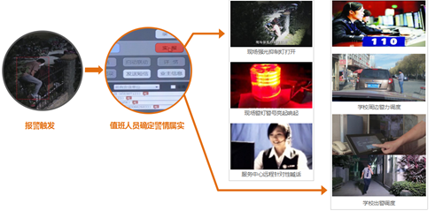 当发现警情时,前端视频报警器将已经过滤后的警情上传至平台指挥中心,中心值班人员通过人工二次复核判断警情是否属实,实现对终端用户的“零误报”专业化报警服务。当确定警情属实后,工作人员只需按下“实报”按钮,案发现场立刻启动声光联动报警,且中心值班人员还可通过对犯罪嫌疑人进行远程针对性喊话警告,驱离犯罪嫌疑人。与此同时,现场报警信息已成功下发至学校相关领导、安保负责人手机、学校值班中心及周边公安110,促使相关部门及时派警。