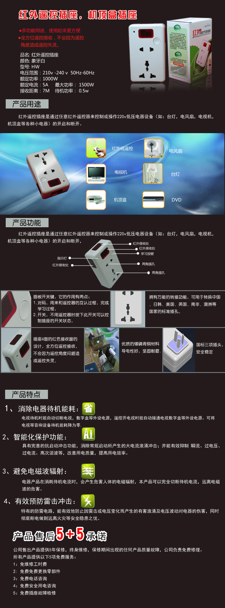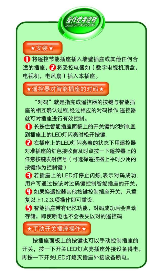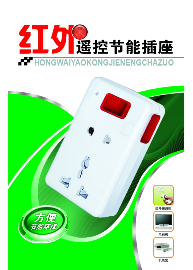 本产品适用于具待机功能的电器,如电视机、机顶盒、家庭影院、电脑等在待机状态仍然会消耗部分电流的电器。当然被连接遥控节能插座的电器遥控关机后,无需手动去切断全部电源,几乎没有待机电流损耗,以实现节能的目的,同时也延长了电器的使用寿命和安全性。也可以使无遥控功能的电器具备遥控开关功能,本插座内置很电脑芯片。可以识别市面上大部份的红外遥控器。