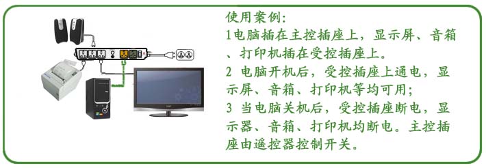 1、消除电器待机能耗:电视、音响、DVD机等待机时能自动切断电源,遥控开电视时能自动接通电视电源。可将主控和被控设备待机能耗降为零,能节约电视机和相关视听电器正常用电的10%-40%左右。广泛应用在商务办公、家用电器的电脑及相关打印机、复印件,传真机等,电视和相关的录像机、DVD机、音响等相关产品电源控制应用中。