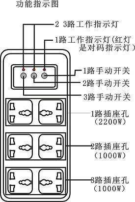 此插座三个开关按扭独立控制三个组插座同时开与关,第1路阻性负载2200W,感性负载880W;2,3路阻性负载1000W,感性负载400W(乌丝灯,发热棒是阻性负载;节能灯,变压器等为感性容性负载)