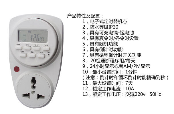定时模式:最大设置开与关程序组数:20组/天(140组/周)