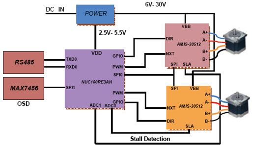 新唐ARM Cortex?-M0内核的32位微控制器NUC100RE3AN保证了电机驱动的稳定高效。电机驱动芯片采用AMIS30512,它是专为实现驱动电机而设计的电机驱动芯片,芯片只需外加少量无源元件,即可满足电机驱动物理层规范功能要求。同时也可以根据需要订制单轴、多轴方案。