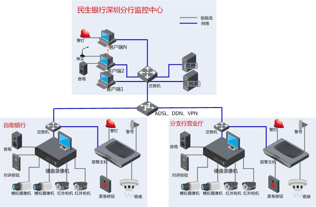 民生银行深圳分行监控中心项目,是基于大华的DSS-F监控中心平台建设,该平台主要实现:远程报警系统、远程对讲系统与远程视频监控系统三大功能进行融合联动;现将已建设的36家网点、50个离行式ATM机组成的完善销售与服务网络,共计5000多路音视频图像以及报警和门禁系统进行统一接入。前端设备:模拟摄像机400多路;后端设备:150多台硬盘录像机。