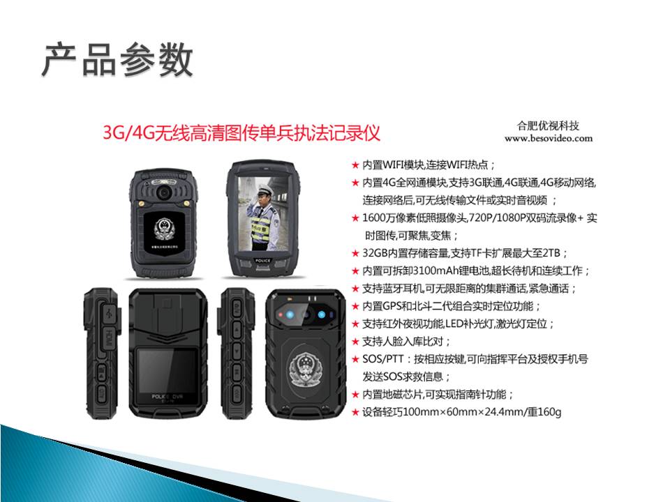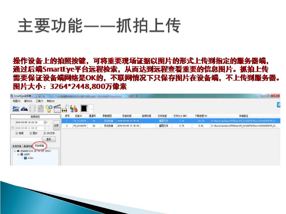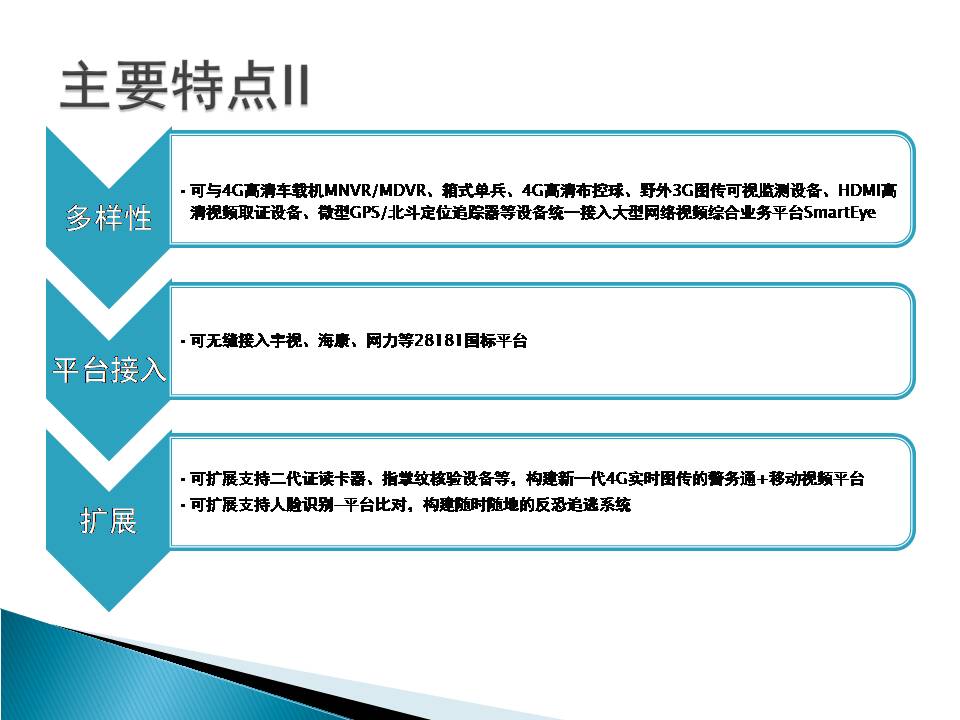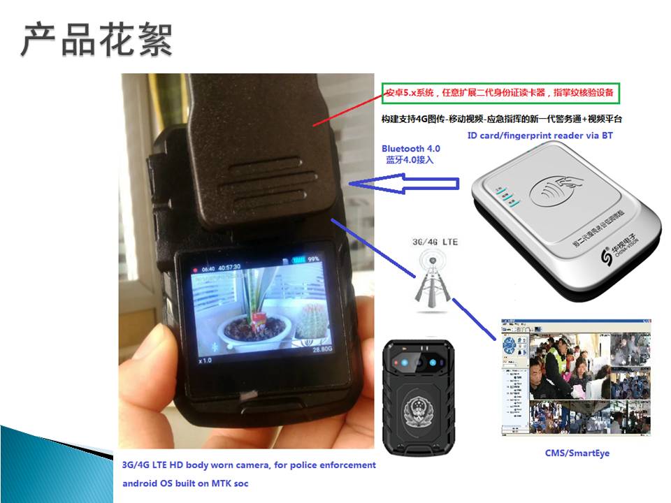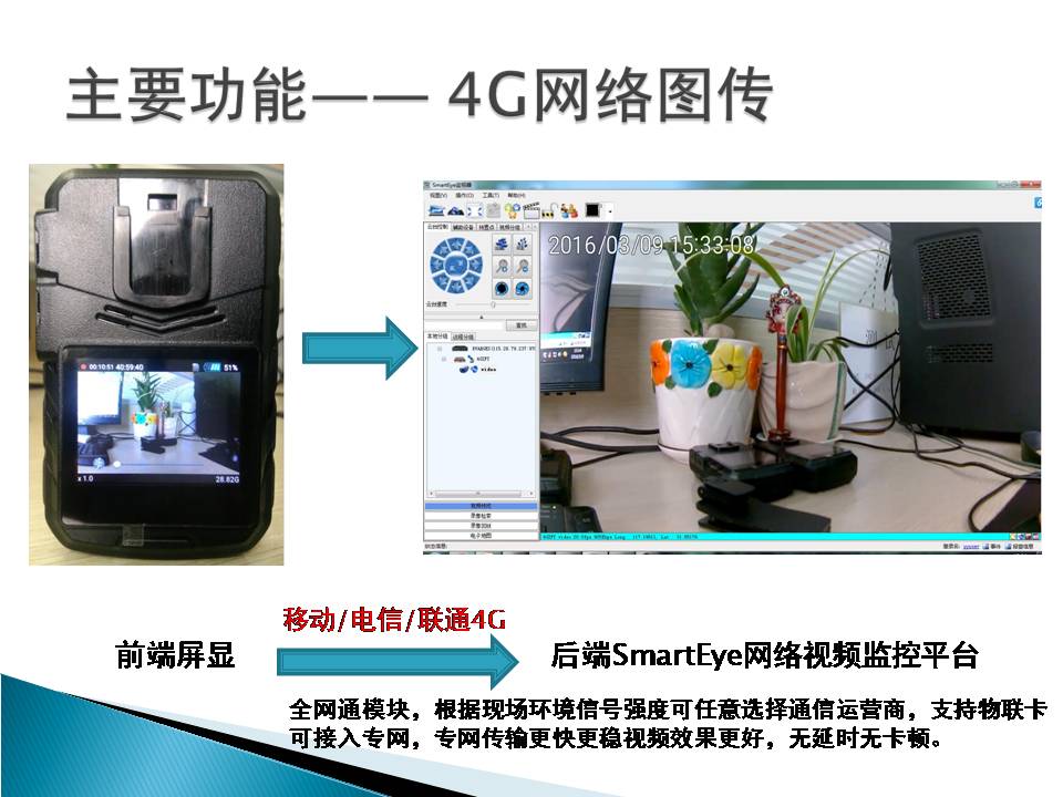 16 | 网络监控平台接入功能 | 本机可通过4G、3G或WiFi网络直接接入大型网络视频综合业务管理平台SmartEye,实时传输视、音频数据,本地录像,双向语音对讲/集群通话,实现远程指挥调度功能。 |