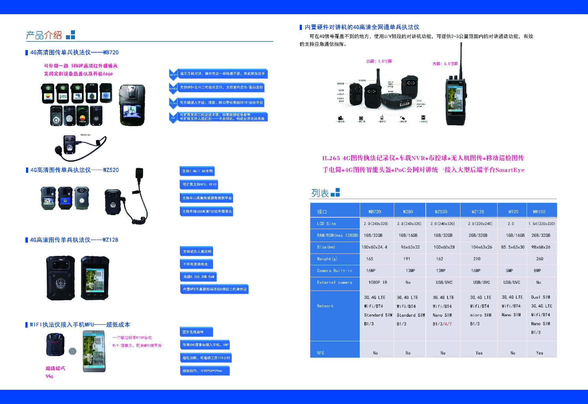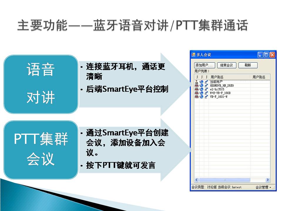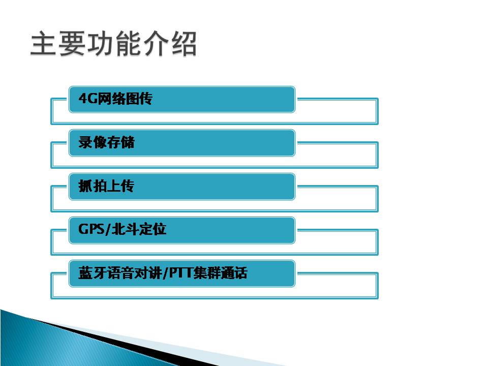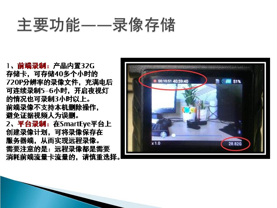 16 | 网络监控平台接入功能 | 本机可通过4G、3G或WiFi网络直接接入大型网络视频综合业务管理平台SmartEye,实时传输视、音频数据,本地录像,双向语音对讲/集群通话,实现远程指挥调度功能。 |
