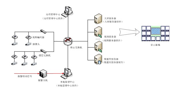 凌久视频监控系统主要由前端模拟摄像头、视频编码器、本地管理中心、远程管理中心、大屏服务器、视频服务器、数据库服务器、网络数字硬盘、显示器墙等组件构成。