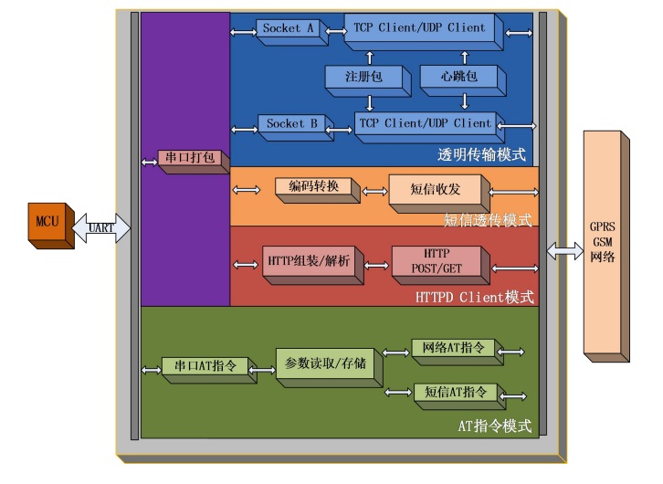 支持多种工作模式:短信透传模式、网络透传模式、HTTPD 模式;