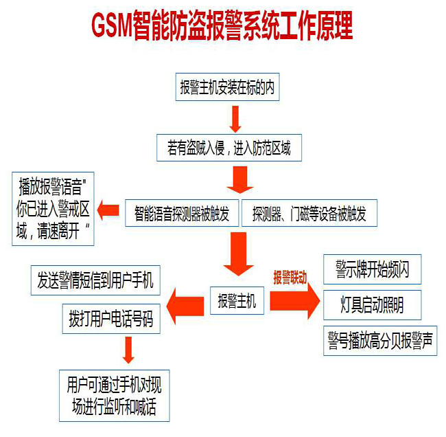 该系统突出的优点是不再依赖于电话线或其它方式传送报警信息,而是借助可靠、成熟的GSM移动网络,直接把报警地点的情况反映到责任人的手机屏幕上,例如:如果有人非法进入警戒区域,此时报警主机内会发出高达120分贝的刺耳报警声,同时报警主机会自动向预先设定的接警中心和责任人的手机发送报警信息:“康联安防提醒,第X防区报警,请尽快处理!”,同时会自动拨打预设的手机。当接听时:报警器自动进入现场监听。监听时关闭警笛。结束后可直接挂机或者监听过程中对方挂机,主机不再拨打后面的电话报警,如无人接听,主机会循环拨打所有电话三遍后,自动挂机;并向所有手机发报警短信一次。如果接听,则认为报警成功,结束本次报警。系统真正实现了全天候、全方位的监控报警。