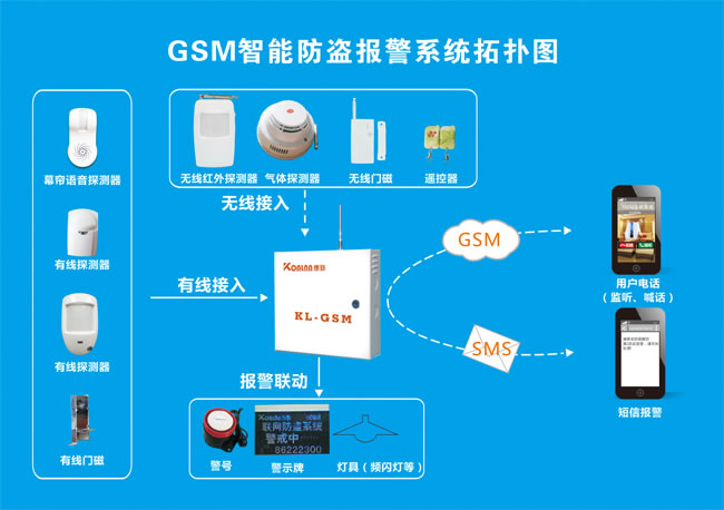 康联GSM智能防盗报警系统是基于GSM无线移动通信的短信/电话拨号报警系统,主要用于店铺、小型工厂、仓库、企业、家庭等场所的防范。系统由报警主机和周边设备组成,周边设备包括,有/无线红外探测器、烟感、气体探测器、门磁、光栅、对射等探测警情的设备及警示灯箱、警号、警灯、真人喊话语音探测器等报警联动设备。主机安装在防范区域的较隐蔽位置,用于实时接收周边设备的信息并对其进行控制。