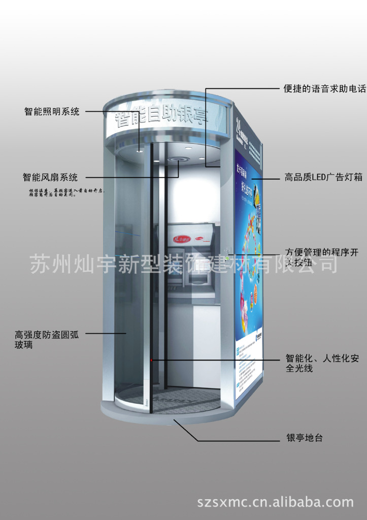 (如此时有其他人去按按钮,系统会提示“本机有人使用,请耐心等待”,舱门继续处于锁闭状态,只有到客户出来以后,外门出门按钮才能恢复正常,从而有效防止“尾随、抢夺”等非法行为)。当客户取好钱后,可按出门按钮或手动旋转按钮出舱,推门后系统自动播放“请妥善保管好你的财务,并确保磁卡已经推出,谢谢光临,再见!”客户出舱后门自动锁上。 三、安全系统功能简介 1、舱体智能探测系统:自动探测用户入舱、出舱活动、舱门开关情况及其他非正常事故情况。此功能与视频监控、报警装置和智能远程开、关锁系统相结合,对ATM机突发情况进行远程应急处理(如远程关闭系统从而延缓犯罪分子逃离时间,为抓捕犯罪分子提供更加有利条件)。 2、智能语音提示系统:客户入舱、进舱、出舱智能语音系统分别自动播报语音,提示用户在取钱时加强安全防范,并可以根据银行需要做相应的语言修改,充分体现了银行对客户的人性化服务。 3、智能远程开、关锁系统:如遇紧急、异常情况(如恶意强力入舱,或在舱内长时间呆滞不动等)时,客户可按防护舱内报警按钮,此时,管理中心可根据视频监控查看实际情况对防护舱门锁进行远程管理(自动锁定或自动开户)。 4、 防护舱设有隐蔽按钮开启位,用于现场紧急处理或智能设备失控管理及维护管理