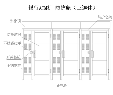1、防护舱体:ATM防护舱体框架采用304不锈钢、冷轧钢板及夹层防爆玻璃等高强度优质护材料组成。框架之间连接均采用焊接方式连接,从而确保整体牢固度。钢架型材一次性成型,有效的达到防护目的和效果。