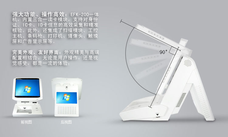 双屏显示,多证件扫描,120°显示屏旋转显示,90°旋转现场拍照,现场拍照,红外线签离