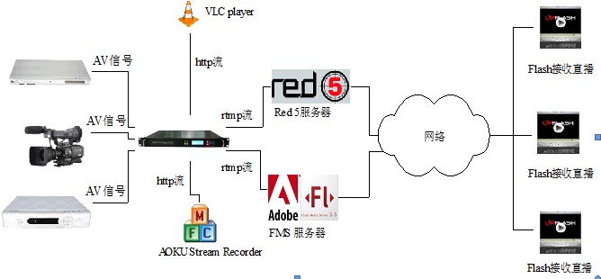 - 内置高性能流媒体服务器,采用http方式支持多达16个客户端直接接入AOKU TVCaster 2100收看直播,支持VLC Player,暴风影音等支持http方式接入的播放器直接接入收看直播;