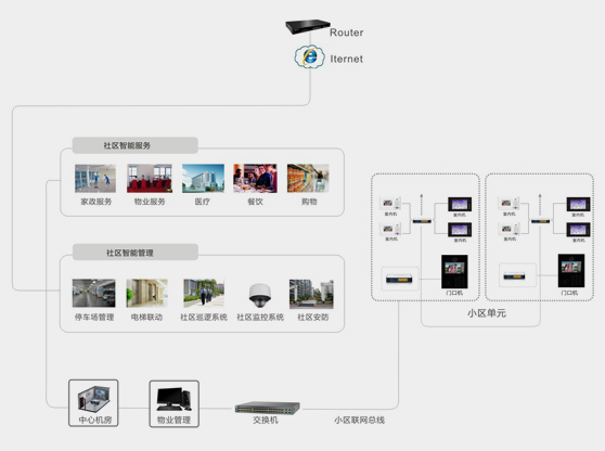 该系统以社区中心机房为枢纽,有机的将智慧家居住户、社区数字化服务、物业数字化管理、社区智能化管理结合起来,真正的实现:住户与住户之间的信息联通;住户享受社区电子购物、家政服务、自动缴费等快捷服务;社区管理自动化。