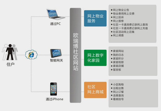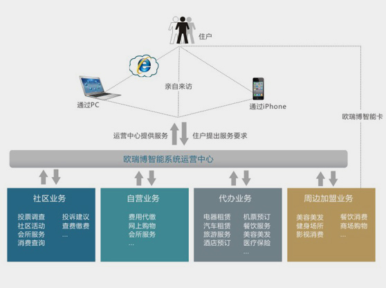以社区现有连通所有家庭的宽度网络为基础,以欧瑞博智能卡为载体,以“完美e家”智能系统为平台,向业主提供综合的、一揽子的服务(包括社区物业服务、自营的增值服务、外协的代办业务、社区内及周边加盟商业提供的会员制商业服务)。