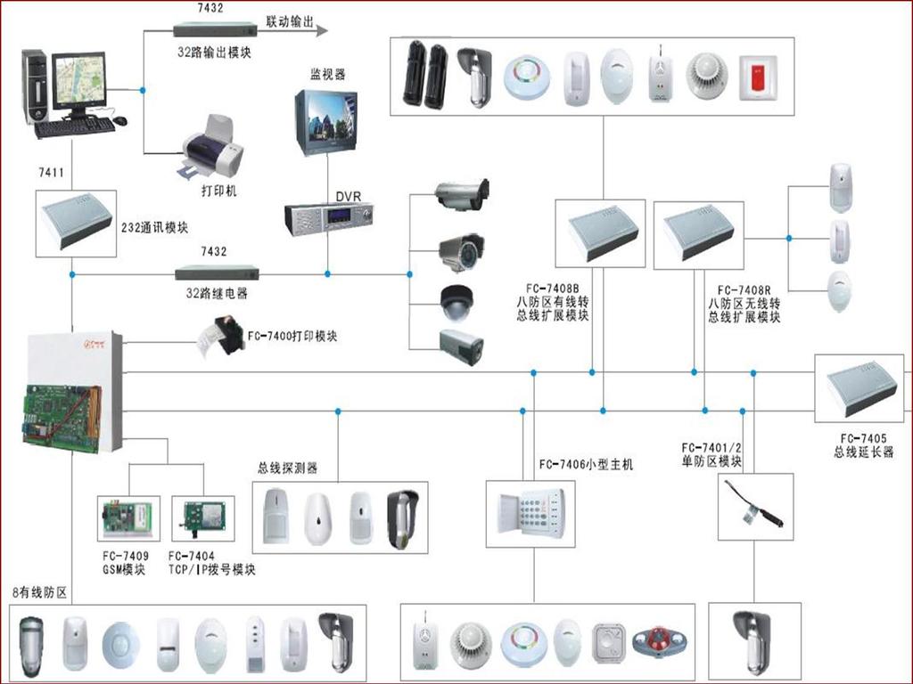 双防区扩展模块FC-7402,六防区键盘FC-6ZKey,及带地址码的探测器。